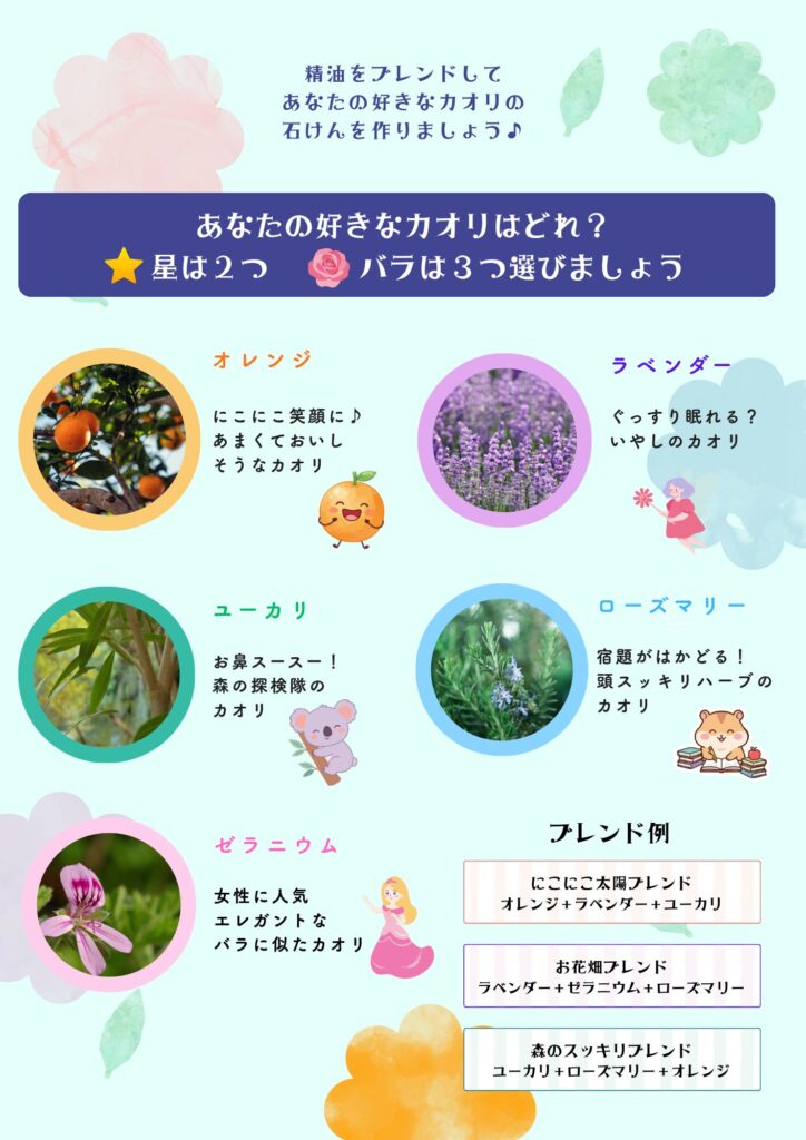この石けんに、好きな精油を選んで、自分好みの香りをブレンドできる体験。